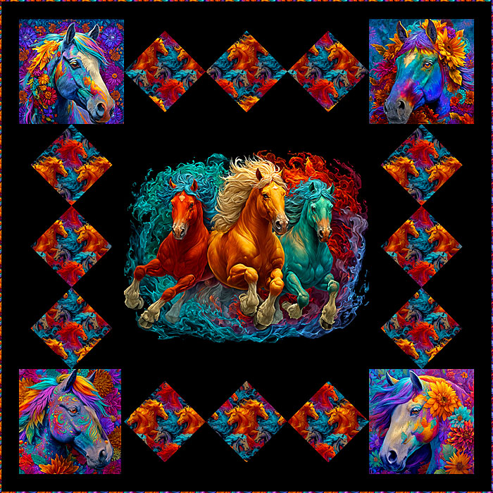 To make this large 85″ x 85″ quilt design, you will start with the 34″ x 44″ panel. Then piece the borders with our exclusive coordinating Horse Lightning Pillow Panel and Allover design, all set against a solid black background.