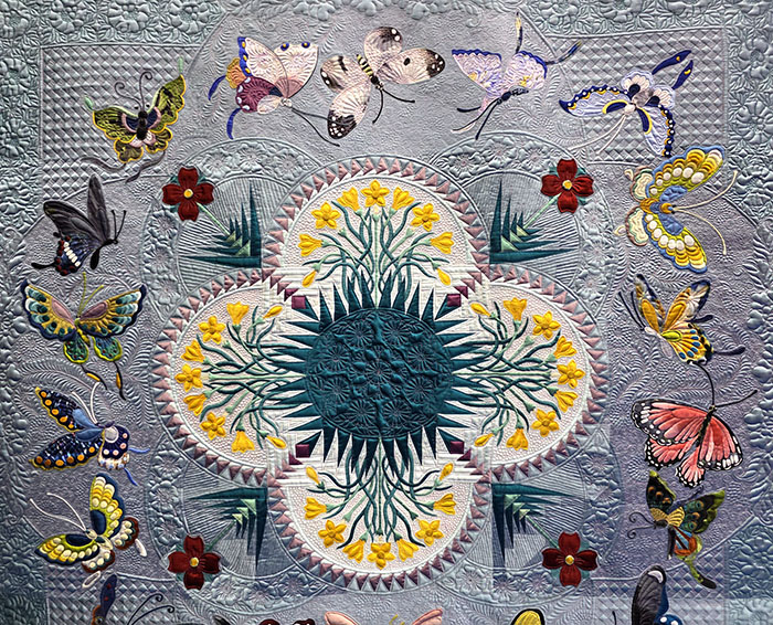 “This quilt has an interesting and unusual background. It’s a unique collaboration and combination of the skills of two women, a Chinese student and her Chinese-American teacher. It shows the meeting of the East and West by incorporating the two traditional methods of paper piecing, the Western technique at the center of the quilt, and the hand applique for the Eastern surrounding designs. The entire quilt is made of silk. Art unites the world.”