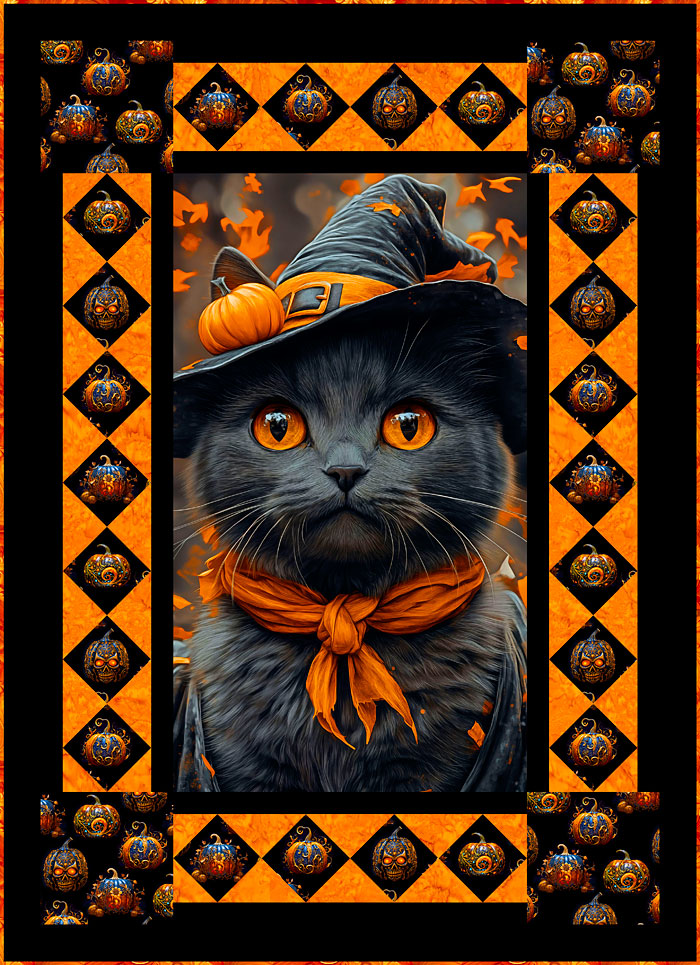 Our adorable Halloween Kitty fabric is back in stock, features an autumn black kitty in a pumpkin grove, in tonight’s Free eQuilter pattern. We love black cats and we celebrate them with this sweet kitty, wearing a festive Halloween witch’s hat and matching scarf.