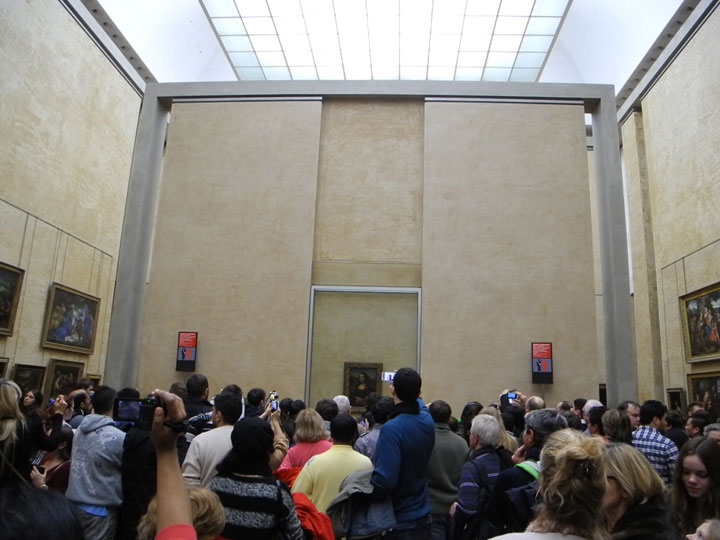 jostling crowd in front of the Mona Lisa behaves as if Brad and Angelina