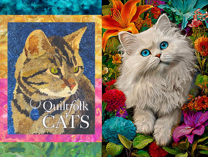 Our exclusive collection of Cat fabrics is legendary…and sometimes very silly. This week we also have the new Quiltfolk book of CATS, which features several of our talented customers’ work. Featured on page 106 is a OBW quilt called “Bedazzled” by artist Jackie OBrien featuring eQuilter’s very own panel by Rubin Design Studio called Intricate Illustrated Kitty.