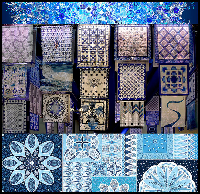 The huge Sapphire Quilt Collection was a centerpiece for the show, giving one a complete immersion experience walking into a vertical cube of stacked Blue and White quilts, gently fluttering as we walked under, through and around this mammoth installation. (Remember the Red and White quilts several years ago? This was the Blue and White version.)