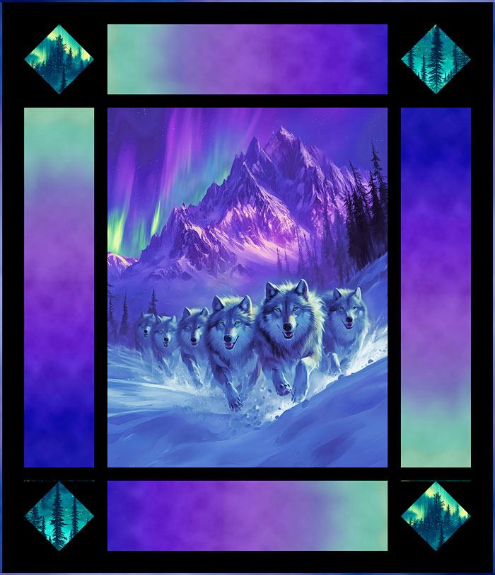 Plus we offer a Free exclusive 57″ x 66″ quilt design! Start with our Borealis Wolf Pack panel, then piece the borders with our Aurora hued Ombre and Moonlit Forest Trees, set against solid black.