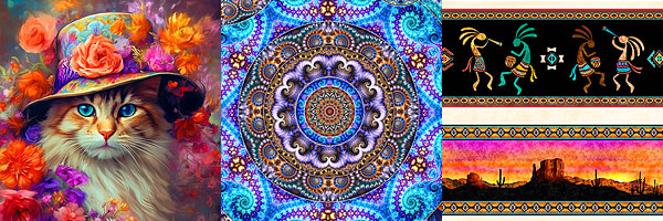 As you may know, eQuilter has had an exclusive line of digital printed fabrics for years now, with hundreds of products in our Rubin Design Studio collections. We got another shipment this week, and if you are a Cat Lover I want to make sure you check out the awesome Black Cats, and the absolutely stunning huge Kitty panel with this lush floral hat. Our staff is already going nuts over the panel, so check it out before it blows out of here!