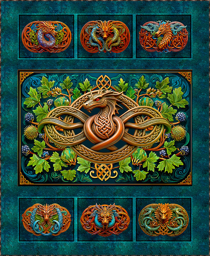 Our best-selling Celtic Forest Dragon panel features an ancient dragon emerging from intricate foliage and Celtic knots.