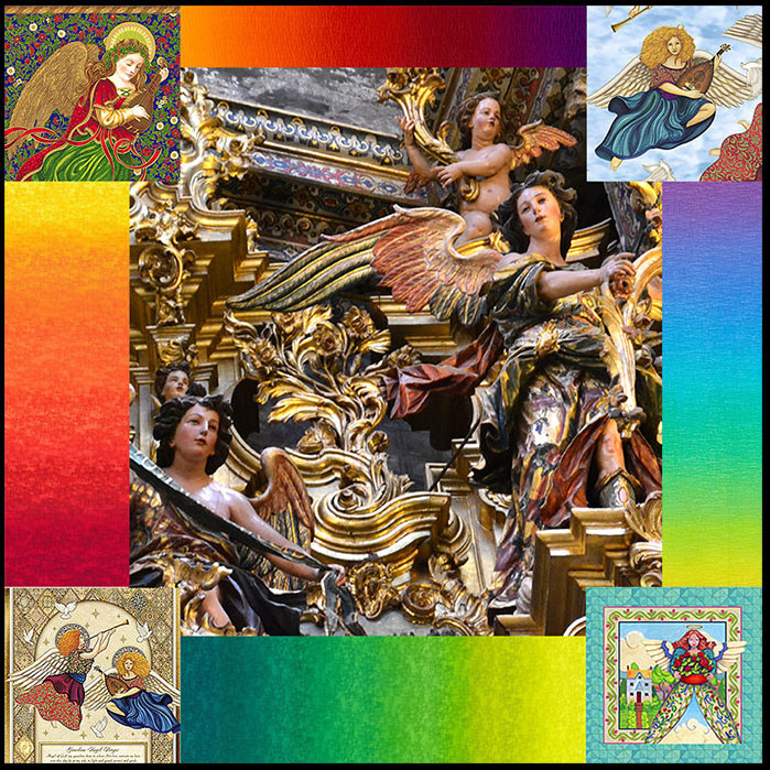 Around this photo, you’ll see a collage of Angel fabrics, and Ombre prints. We just adore our collection of Ombres, because they give such a sense of dimensional Light in a piece. If you make sashing and borders with Ombres, it will give a luminous quality to the piece.