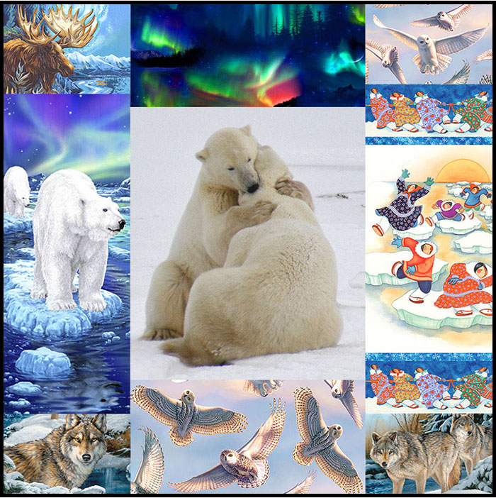 We’ve made sure to stock fabrics related to the Arctic – including polar bears, snowy owls, Northern Lights, and Inuit people. You can see some of these fabrics in a collage around my “Bear Hug” photo.