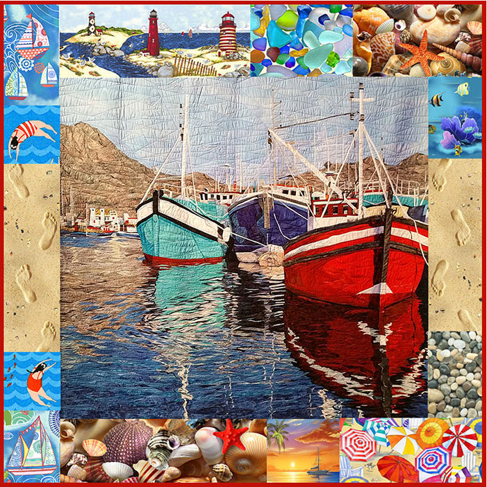 I’ve made a frame/collage to go with the photo, showing some of the ocean-themed fabrics we have in stock now.