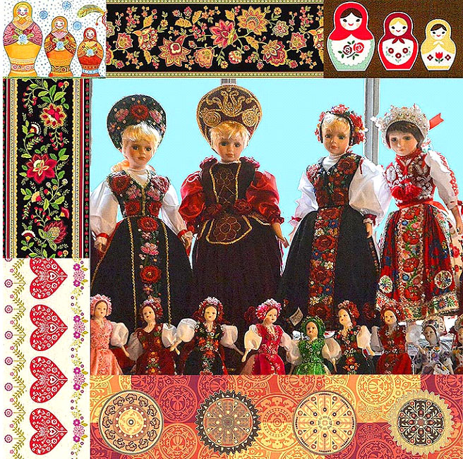 One of the things I love to photograph when traveling is rows and rows of souvenirs. Fortunately in Hungary one popular type of souvenir is DOLLS. These were so pretty I just had to share…because they were dressed up in embroidered dresses that reminded me of some of my favorite florals at eQuilter.
