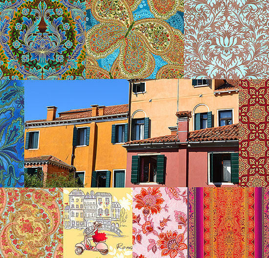 I am also taking a series of color reference photos, and here's one I really loved because it shows 3 colors of the Terra Cotta with a complementary Blue sky. I've surrounded the photo with fabrics in the same color story, to give you some design inspiration.