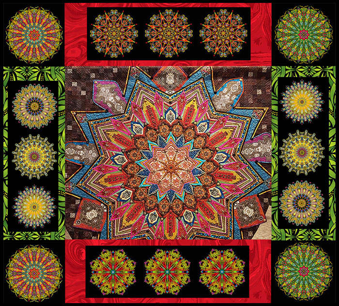 Last Friday I went to the opening of the ‘Evolutions’ exhibit at the Rocky Mountain Quilt Museum. There was a stunning mandala quilt called “Dear Paula, With Sincere Thanks” by Karen Fisher. It was Karen’s tribute to her teacher Paula, and I am featuring the center detail in this week’s collage. (The fabrics around the border are in stock now.)