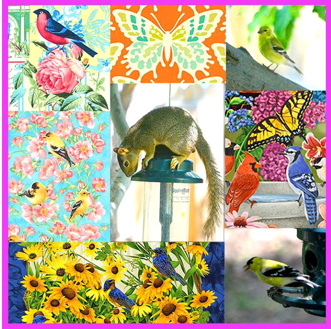 Here is a collage of my goldfinch and squirrel photos, with bird and butterfly fabrics.