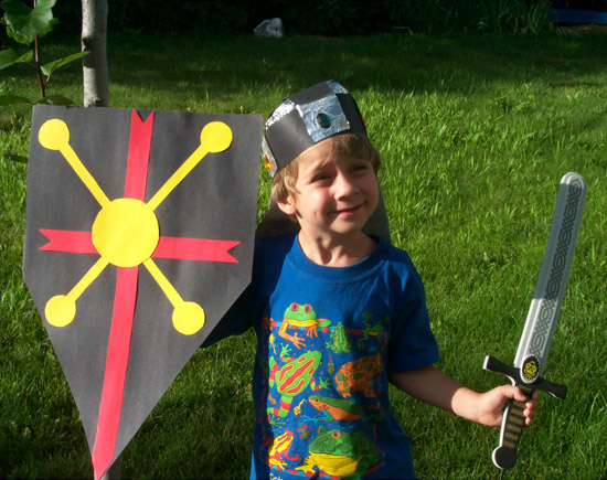 So this is a picture of Sam, our middle child, at age 5 which was about the time we were reading the taped-up version of Where the Wild Things Are. This was his response to the book. Make a costume and pretend to fight Wild Things.