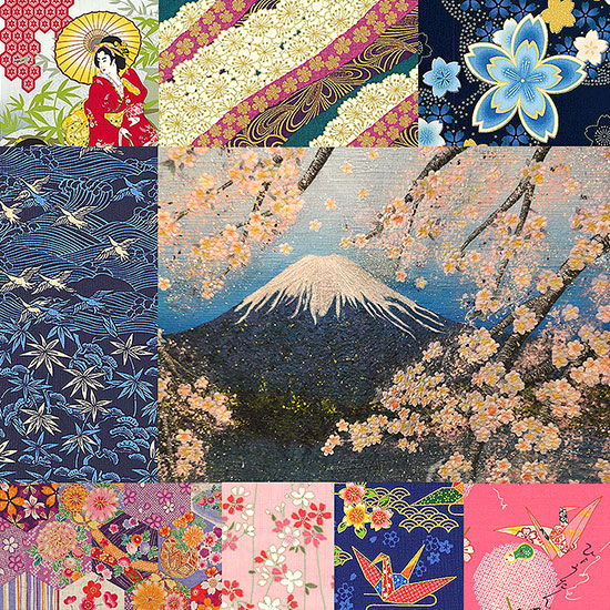 The collage above is centered on Masako Sakagami's quilt "Fuji and Sakura", plus several of our current favorite Asian fabric designs. (This quilt is also in the latest video)