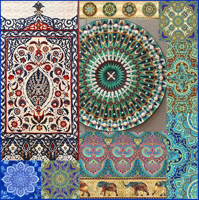 Ottoman Odyssey (vertical quilt on the left) was inspired by her visit to Turkey, and Memories of Morocco (green mandala) is self-explanatory. Her work reminds me of what I saw at the Alhambra in Andalucia in Spain last year, and also of the Egyptian quilters – the Tentmakers of Cairo. The Moorish and Islamic patterns and designs with flowers, geometrics and paisleys are so captivating, with the jeweltones of the glazes used in their ceramic tiles.
