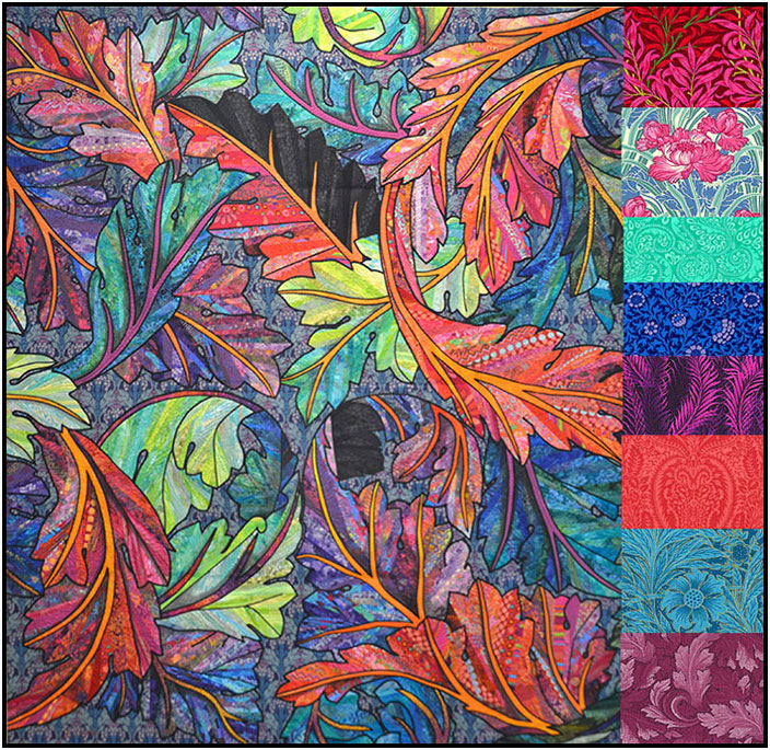 Along the right side I’ve added some William Morris reproductions and other fabrics in stock at eQuilter now…to pick up the bright colors in Yoko’s absolutely delicious quilt.