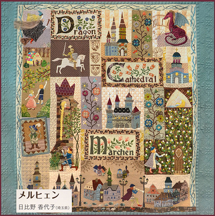 Here is an incredibly detailed applique quilt by a Japanese quilter (her name in Kanji characters in the bottom left corner) which I saw at the Tokyo Quilt Festival in January.