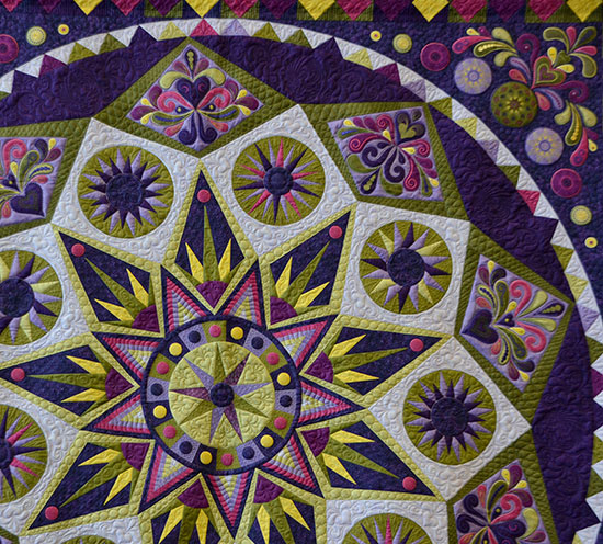 "The idea for this came together pretty much all at the same time. First a series of technique demonstrations, Sarah Vedeler's Sedona Star pattern (used with permission), the colors from a TV commercial for New Orleans and a Mardi Gras mask purchased in Italy. I digitized the mask and used it on my longarm. Two layers of batting (one wool and a silk/bamboo/cotton blend) give it a trapunto look. It is paper pieced, embroidered, appliqued."