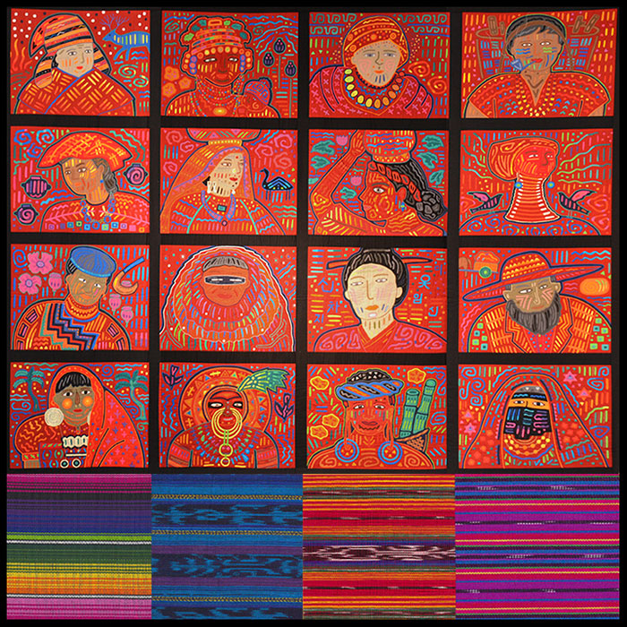 Fumiko’s incredible work has a mind-blowing amount of detail in the hand-stitched mola applique and embroidery, and in this large retrospective, I was fascinated by her portraits of women from around the world. She lovingly portrayed the ethnic costume details of men and women from a wide array of cultures in this huge wall-hanging. (This is only a part of a larger installation.) Her individual portraits have such personality and colorful flair, you can’t help but stare at each one with a gaping grin.