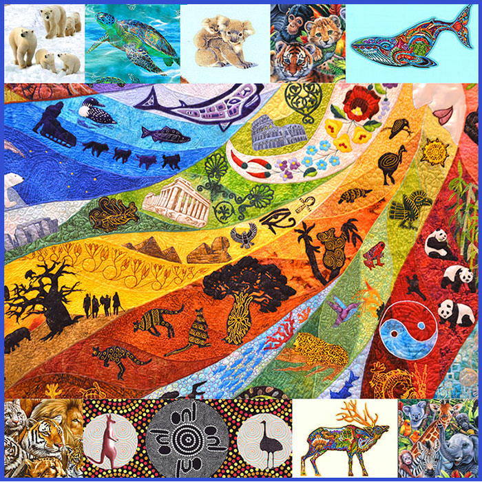The eye goes to the animals in the quilt, which are rendered in a very graphic way, but with lots of delicate stitching details. You can stand and look at this quilt for a long time because it tells so many stories, and each visual story is so fascinating. I am posting photos of the quilt and the details on my photo page so you can appreciate all the thought that went into this piece. She uses the artwork of the indigenous people to tell each story – using Celtic knots, Pacific Northwest Native art, Aboriginal dots, etc.