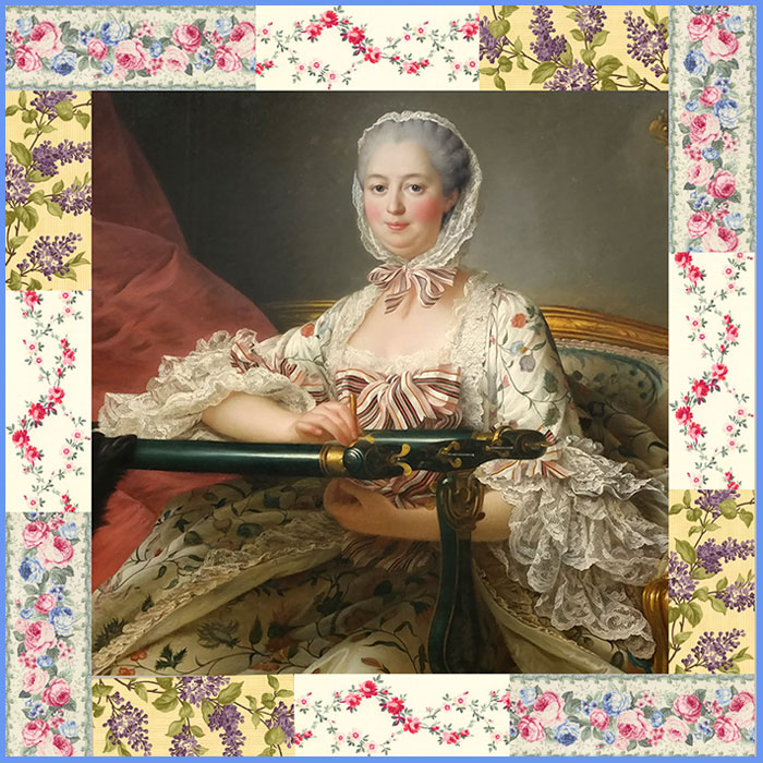 The photo collage above is a painting by Drouais, of Madame de Pompadour at her embroidery frame. She is wearing silk, embroidery and lace…sitting with tambour needle and thread. My how times have changed. We often sit with needle and thread in our jammies now. You can see this painting at the National Gallery at Trafalgar Square in London.