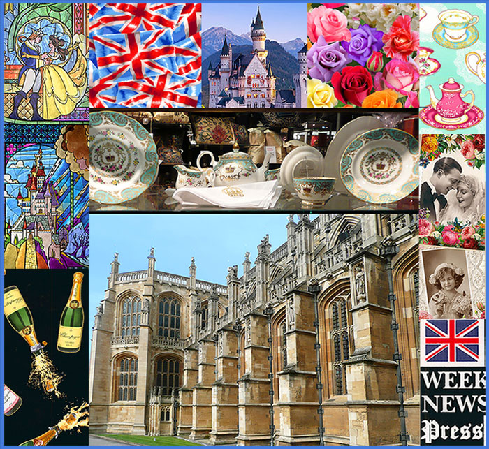 The collage above features photos of the St George Chapel in Windsor, Royal China in the Tower of London Gift Shop, and fabrics currently in stock.
