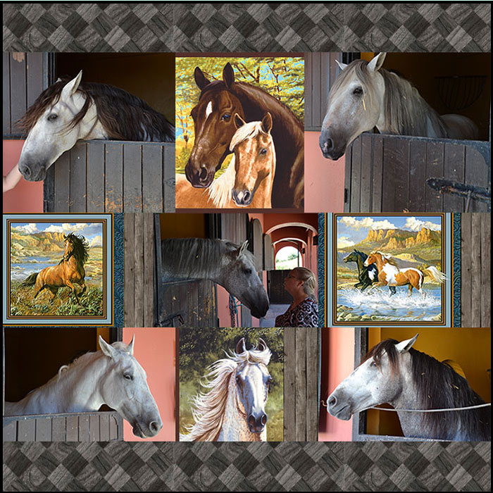 Here is a collage of photos from this farm, including a gorgeous Grand Champion in the top left, and in the middle that is me about to get a velvety kiss from a curious boy. I’ve added in a few of our current horse-themed fabrics.