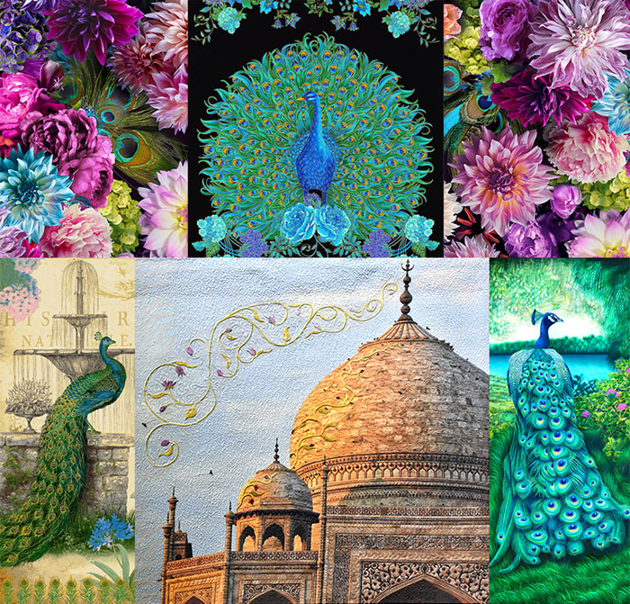 I have set it in a frame of peacocks, flowers and feathers. I visited the Taj Mahal at Sunrise several years ago, and in that quiet moment of golden light, I imagined the shimmering dome surrounded by flowering gardens and peacocks.