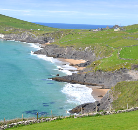 This scene is spectacular because you come around the bend on a narrow snaking road high above the cliffs and crashing waves, when suddenly there is a dramatic sweep of green, with dark rocks that drop suddenly to the beach, and then the turquoise water sparkles beyond. A few simple cottages are seemingly tossed across the landscape, and the ubiquitous grey rock walls stretch up the sloping hillside, containing hundreds of sheep and cows.