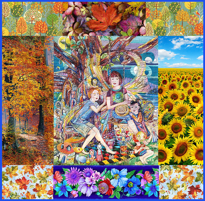I’ve set it in a collage of seasonal prints, including a forest, a field of sunflowers, and falling leaves. We celebrate the coming season of Harvest with fabrics that capture the colors of Autumn. It reminds me of my own kids when they were little….jumping in piles of leaves, gathering armloads of sunflowers, wandering along a forest path dappled with bright sunlight. There are many ways to celebrate our memories, with our quiltmaking.