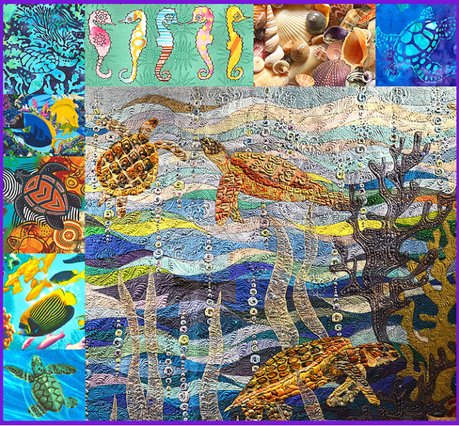 * The collage above features “Turtle Bay” by Claudia Pfeil, photographed at the Festival of Quilts in Birmingham UK, plus a selection of sealife fabrics now in stock at eQuilter.com