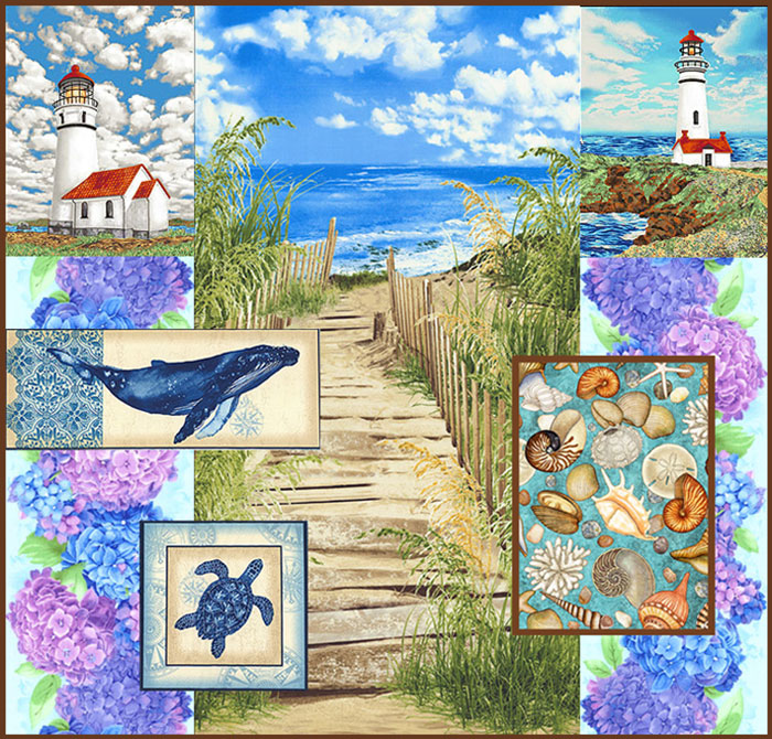 I am seeing lots of design that features themes about the OCEAN, WATER and TROPICAL flora and fauna. Barkcloth is back! Palm trees, tropical florals, parrots, and whales are some of these upcoming print trends. I’ve put together a collage of some of these fabrics, to evoke a summer on the New England coast. Perhaps you are planning a summer vacation to a coastal town with a beach like this?
