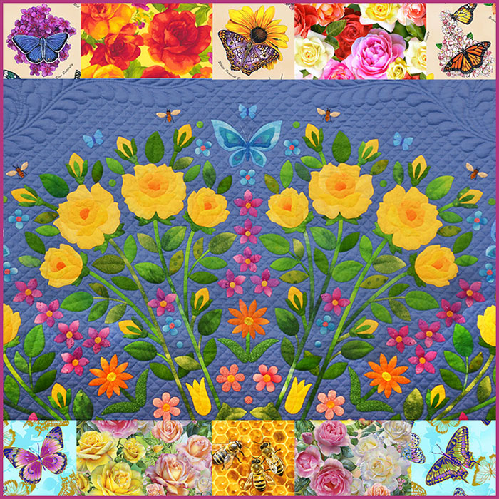 I have added some of our rose, butterfly and bee fabrics in a collage at the top and bottom. There is something so comforting about floral fabrics, particularly rose prints, perhaps because we learned about quilting and sewing from our grandmothers who also tended summer rose gardens. Anyway, that’s my family story about sewing and flowers….they always seemed to go together.