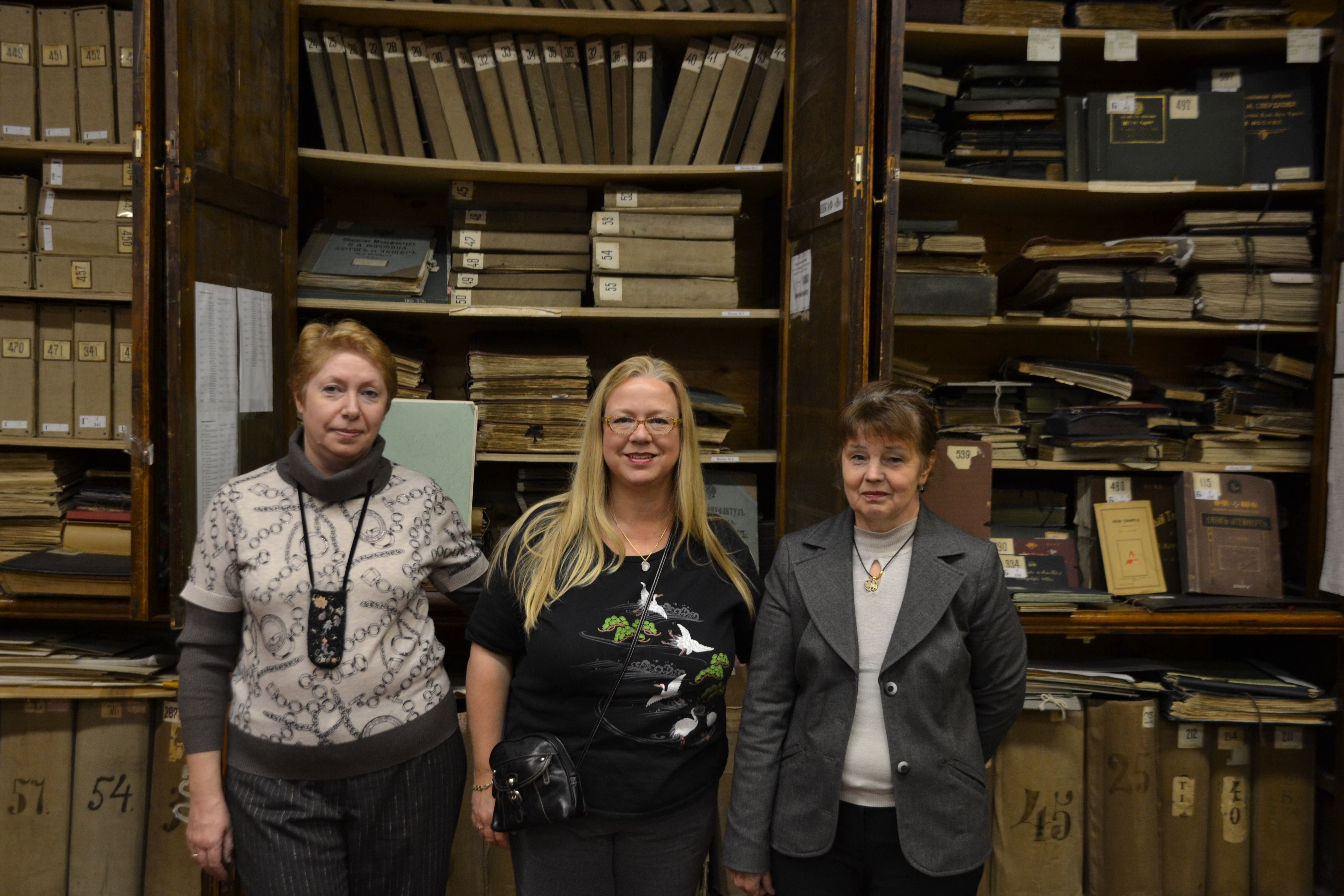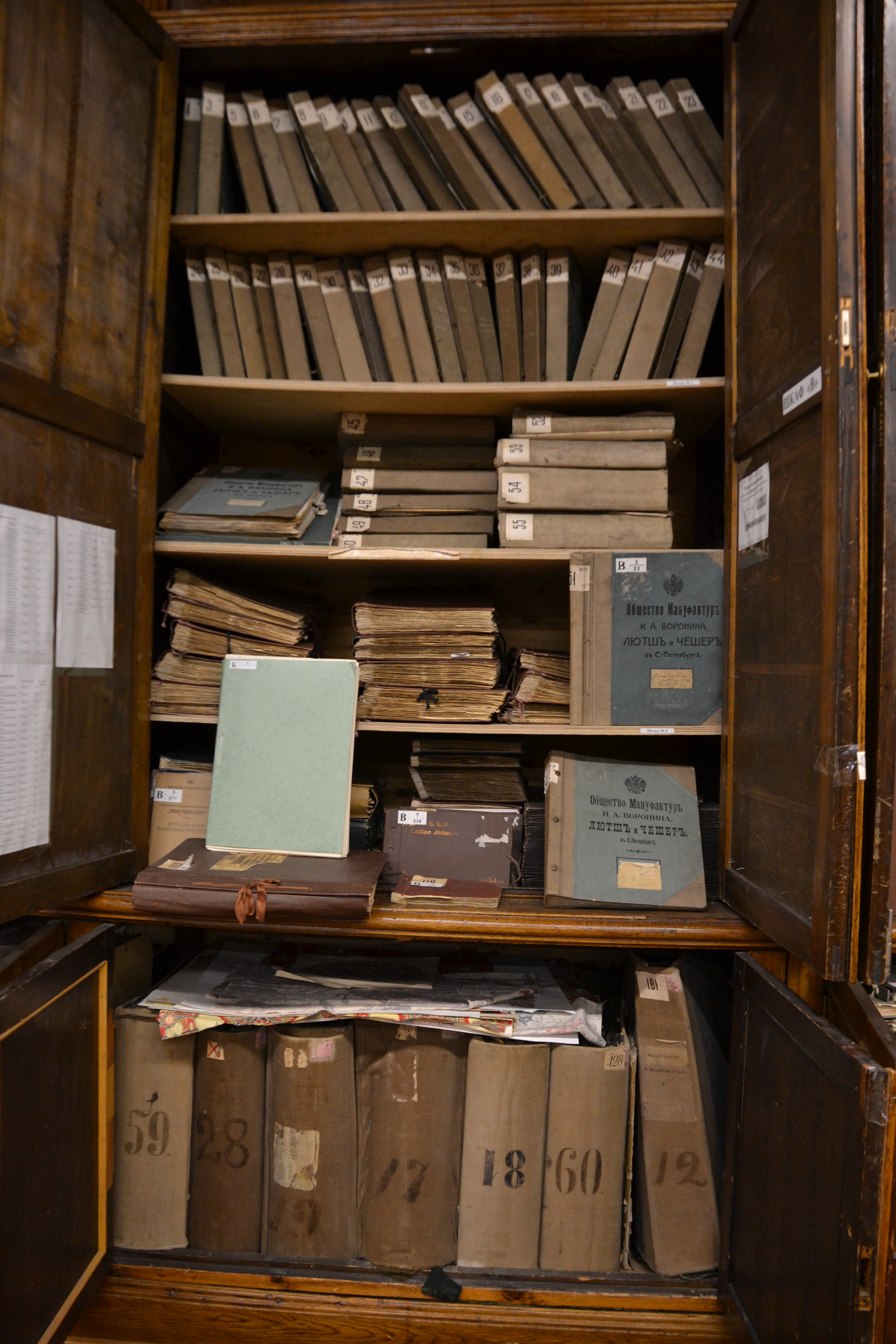We were greeted by a professor Tatyana who had agreed to give me a private tour of the school's textile museum. I had absolutely no idea what to expect. We went up several floors and waited in a classroom. Tatyana got a key and opened a door that led into a long hallway that was filled with textile display cases and wall hangings. Then we turned right into a large room – and I quickly realized that I was in not just a museum, but a library filled with the history of the Russian textile industry.