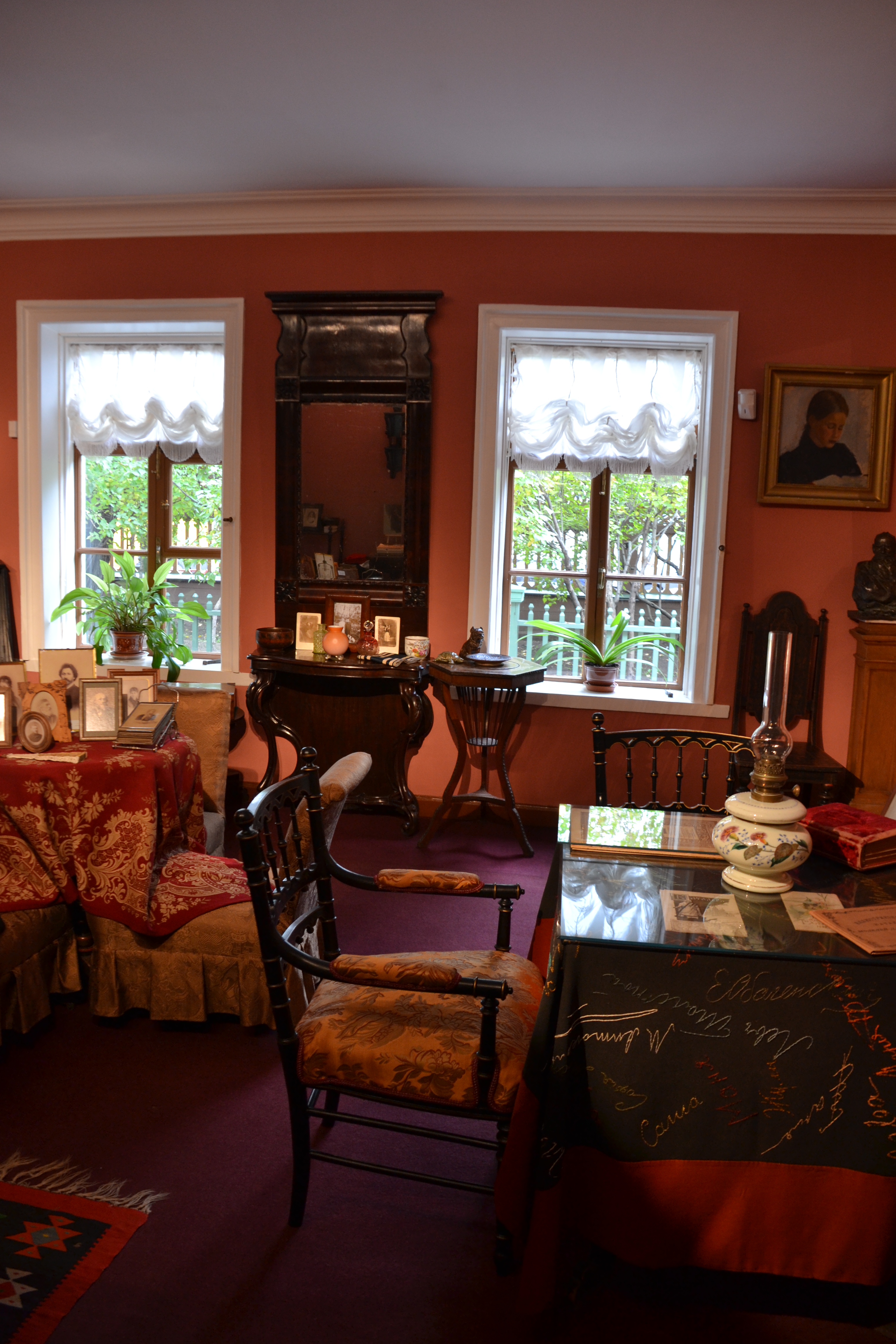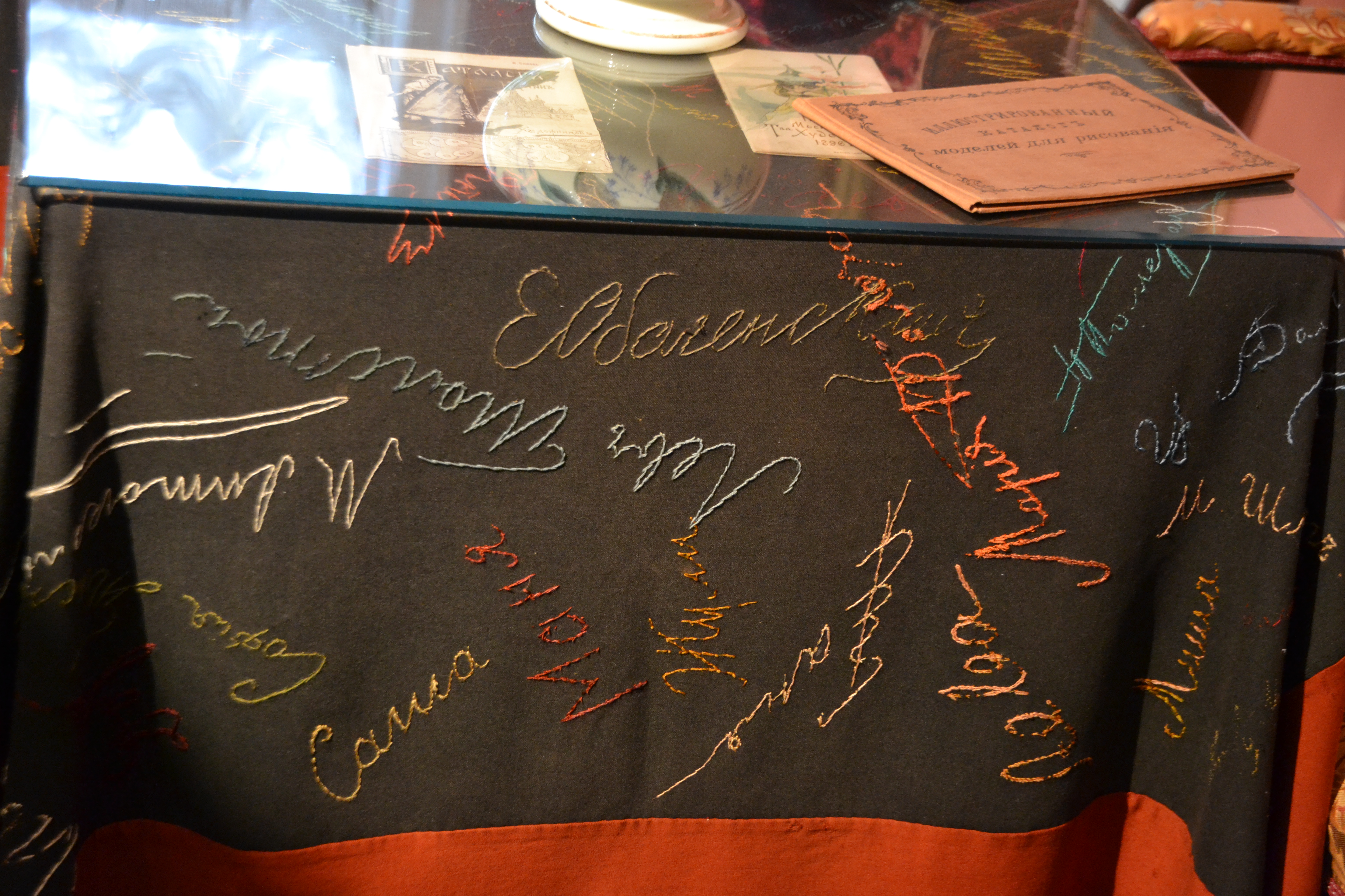 In daughter Tatyana's room (she was a portrait artist) there is this delightful black tablecloth with 70 embroidered autographs – first written in chalk by visiting friends – then embroidered by Tatyana.