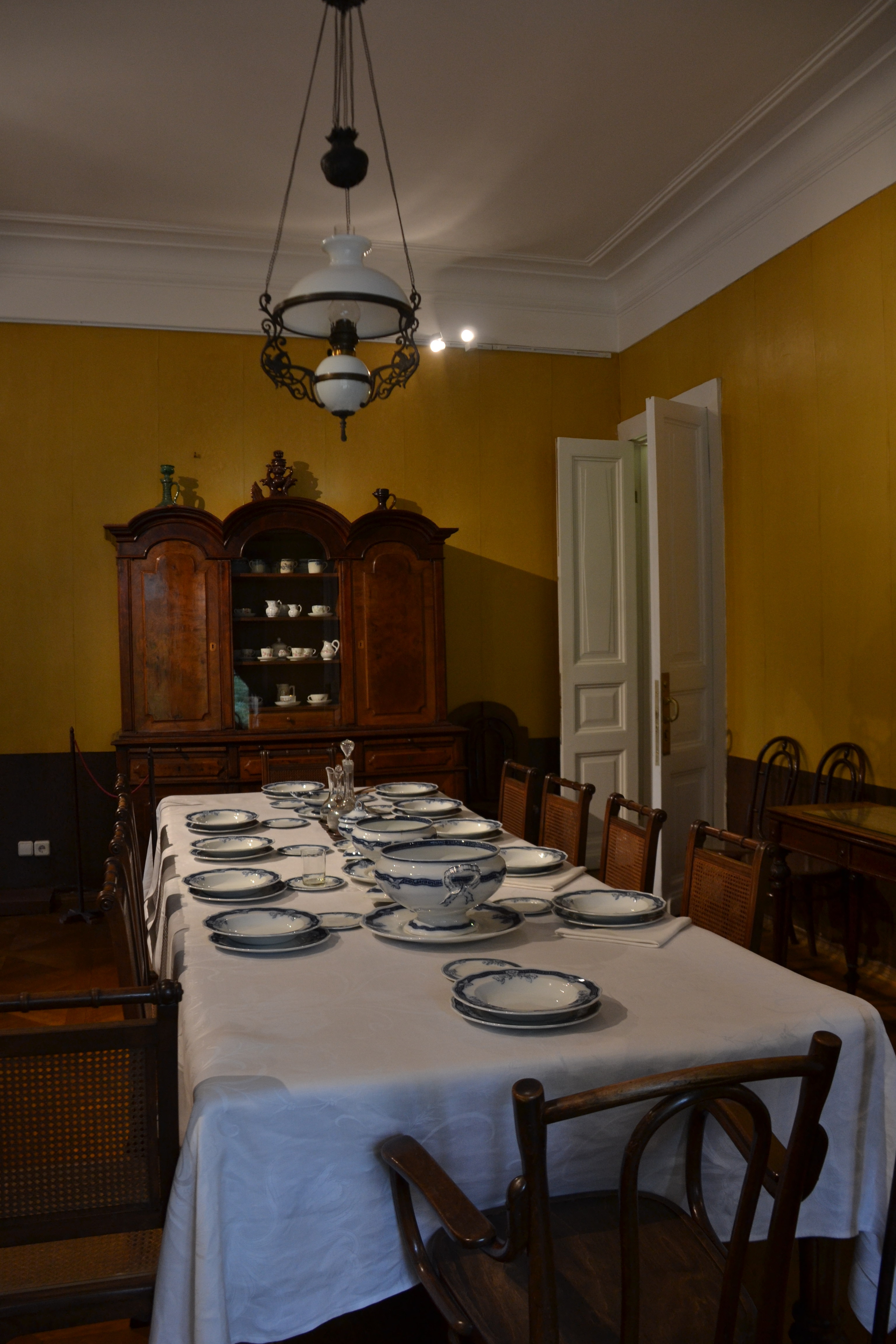 There was not just one, but TWO grand pianos in the house: a baby grand on the ground floor in a private family room, and a large grand in this upstairs entertaining room that had a huge long dining table, lots of chairs, and Limoges china tea service. Here the Tolstoys received guests and held musical and literary evenings, with visitors such as Rachmaninoff, Rimsky-Korsakov, Chekhov and Gorky. Here Tolstoy read his manuscripts to family and close friends, and also played chess.