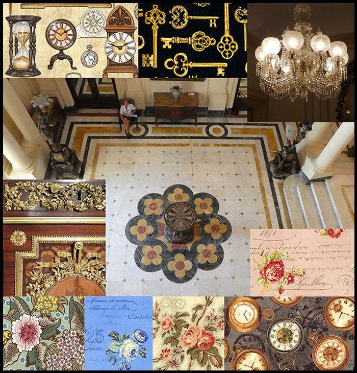 In this week’s photo-and-fabric collage, we are looking down into the entry hall of the Museum of Decorative Arts in the Vedado district of Havana.