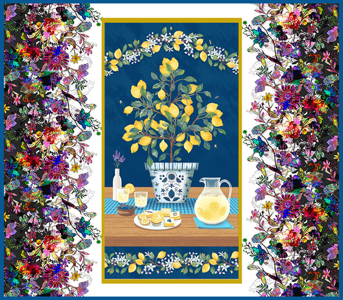 Lately I’ve been viewing images of beautiful flowers and lush gardens, before I go to bed. That way when I close my eyes, I see those floral images…and I imagine walking along fragrant pathways as I fall asleep. The image above is a combination of a floral double border, and a lemon tree panel…with some solid yellow, blue and white…makes a lovely imaginary view of a garden through a picture window. Dream on!