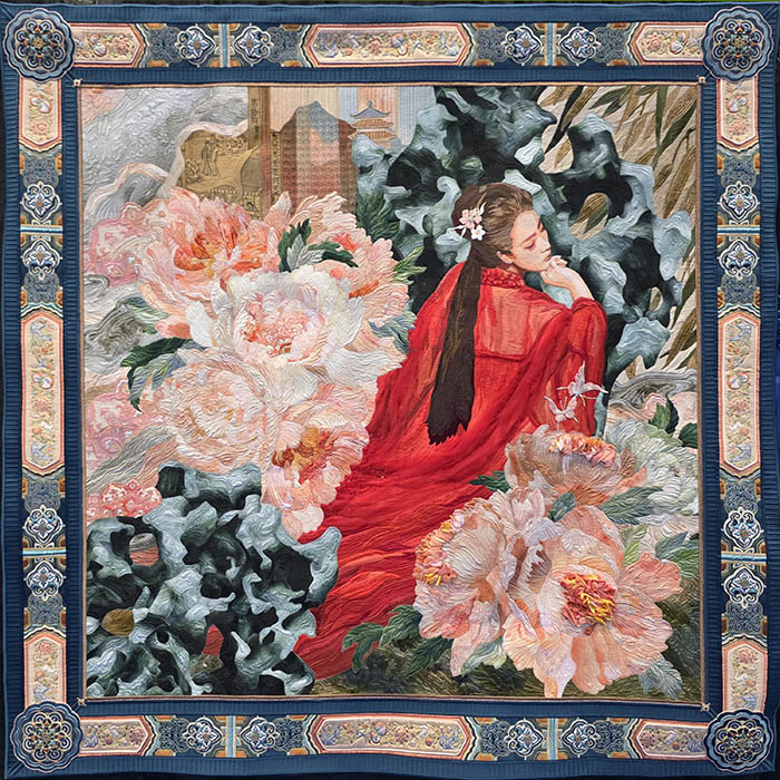 This year Chen Jing won the First Place in the Pictorial category for this 62″ x 62″ floral and figurative art quilt – “Peony Dream”.