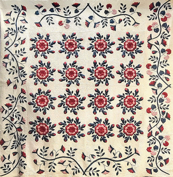 This delightful vintage confection (above) is a 19th century quilt from New York state, part of a collection that was presented by Sharon Waddell at this event. The applique reminds us of the fine handwork that we see in contemporary Japanese quilts. I took this photo as I ran through her exhibit, and the next 2 times I tried to return the doors were locked, so I am sorry I was not able to photograph the information card next to the quilt. I tried.