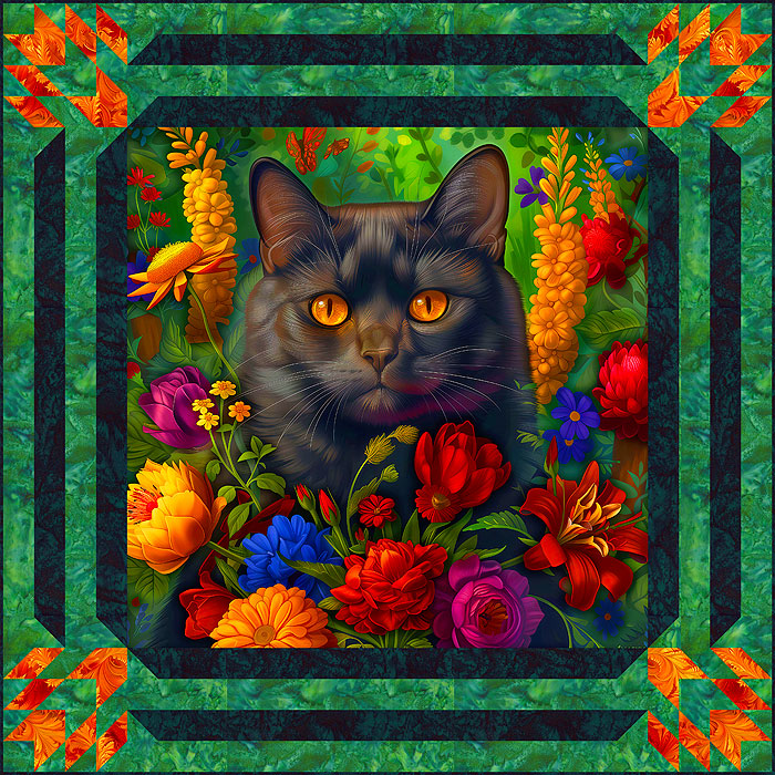 Our exclusive Fabulous Floral Kitty fabric depicts a cuddly kitty nestled in a brilliant floral garden.