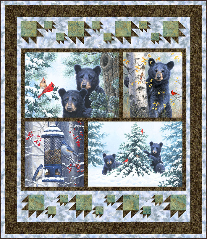 You will make this quilt with a large 42″ x 44″ panel that contains the 4 large block vignettes, then add 4 coordinates to piece the Bear Claw blocks in the top and bottom borders.