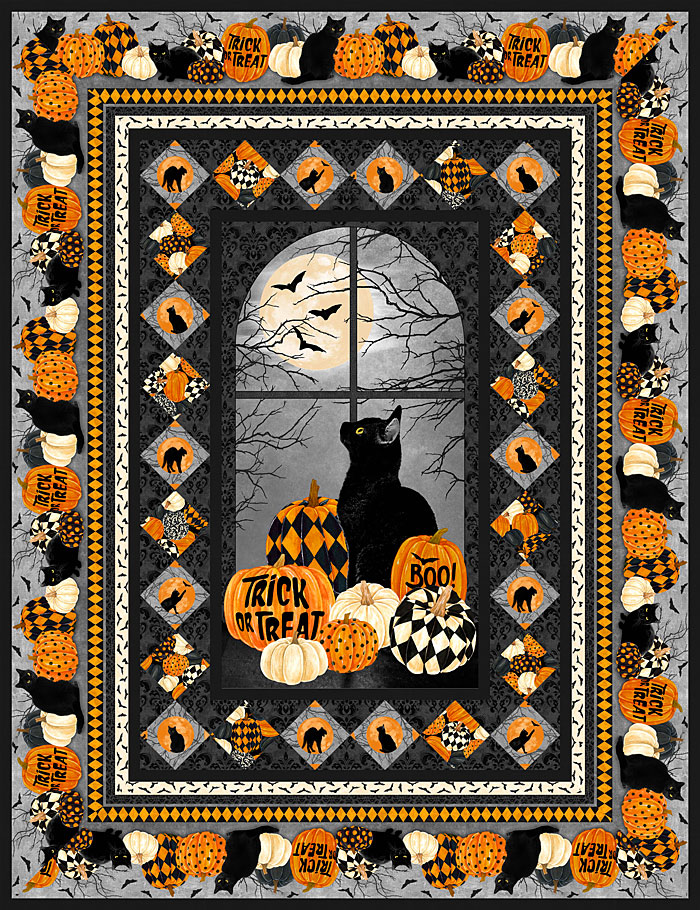 To make this 60″ x 78″ Halloween-themed quilt, you will start with a 24″ x 44″ panel. Piece 3 coordinates from the collection, plus Kaufman Kona Solid Black for the inset squares on point. The clever engineered border is made from the matching stripe!