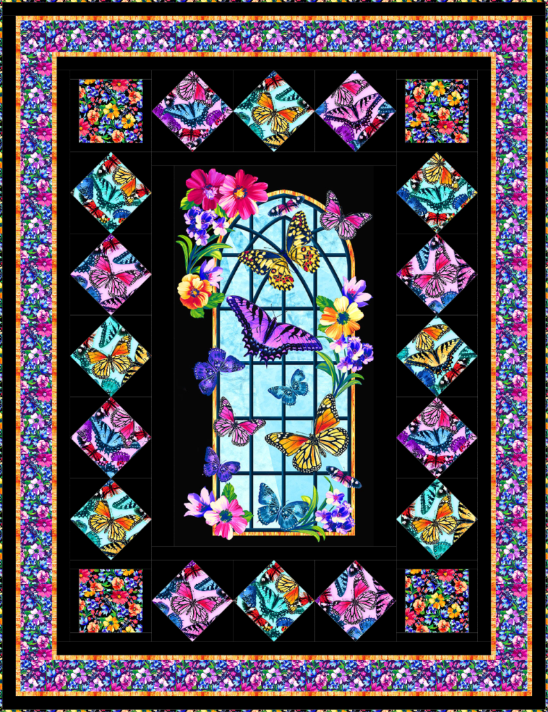 The luminous colors really “pop” on the back background of this 60″ x 79″ quilt design, starting with the Butterfly/Window central panel, adding painterly Cosmo florals, and Kaufman Kona Solid Black.