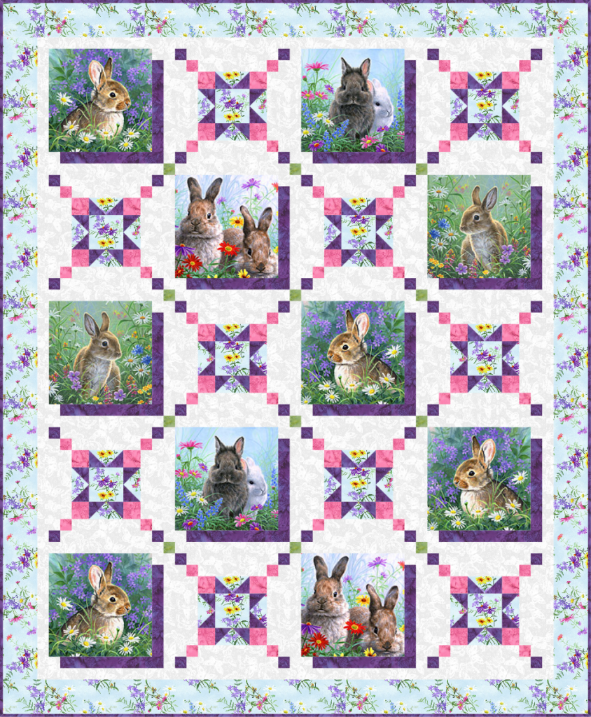 This sweet 52″ x 62″ quilt design features vignettes of one or two bunnies sniffing a warm breeze and sweet blossoms, in a grassy meadow full of colorful wildflowers. Bunny blocks are set in Diamond shapes made of up Floral Mid-tones (Pink, Purple and Green) with Irish Chain little blocks between connecting Windmill stars. The crisp White-on-White Butterfly background sets off the fresh colors in this Happy-Hoppy quilt.