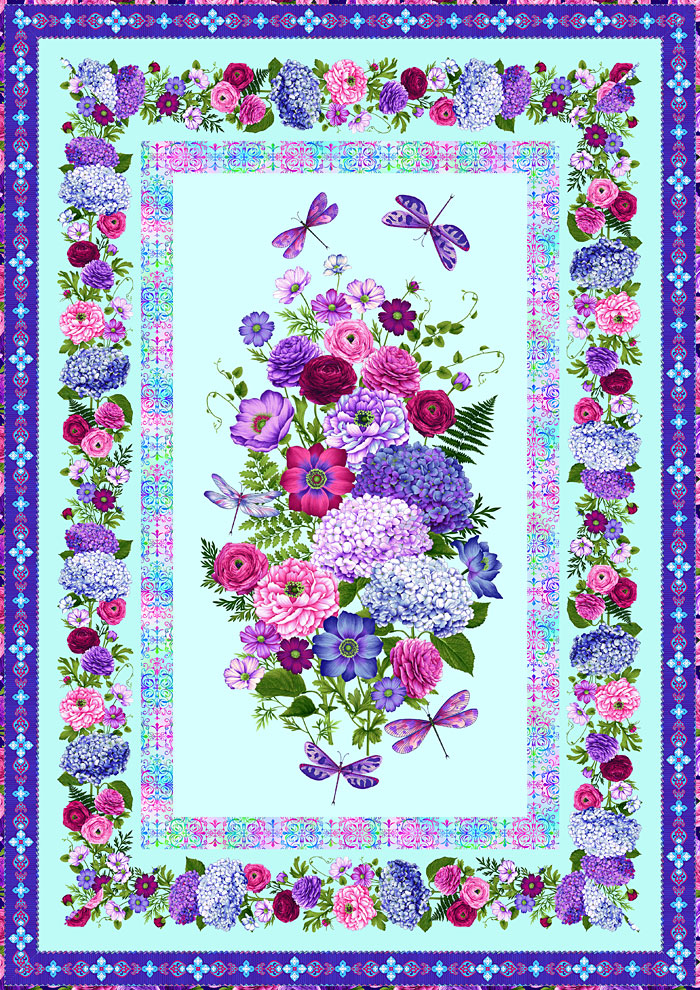 To make this 43″ x 62″ quilt design you will just need the main panel, the stripe for a border, an allover floral and coordinating filigree. It’s a quick easy project to lift your spirits or bring a little sunshine into a loved one’s day.