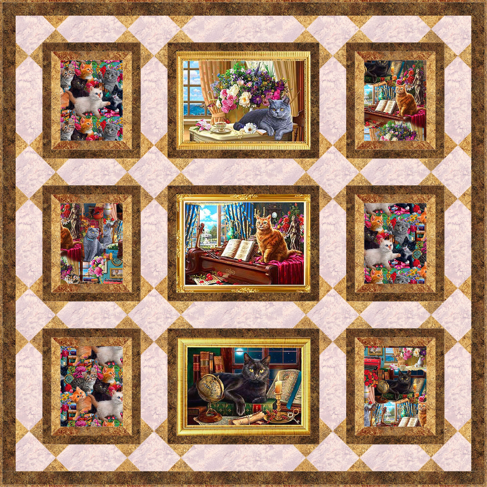 This colorful eQuilter Free Quilt Design starts with a panel of three elegant cat blocks along with two allover kitty prints, then adds Northcott Stonehenge tonal prints and a Hoffman Hand Dye to piece the quilt. The clever piecing frames each kitty scene to create a quilt full of museum-like masterpieces.