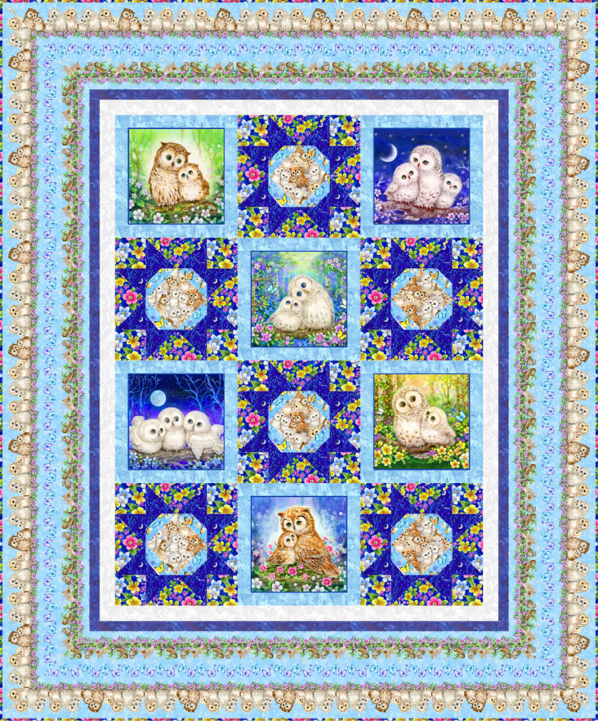 This 58″ x 70″ quilt design is perfect for a youth bed, and will give your little owlet sweet dreams, set in soothing colors and a delightful forest and flower garden.