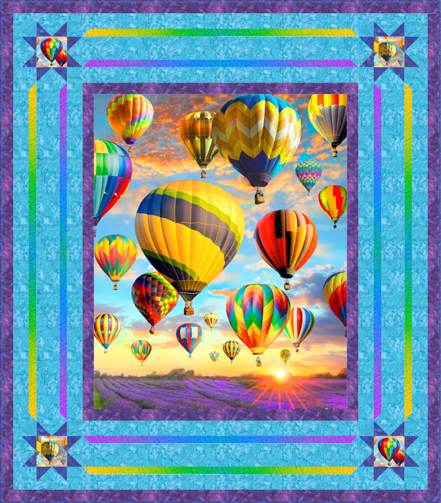 To make this 58″ x 65″ quilt design, you will start with the central 36″ x 44″ digital-printed scenic panel. For the pieced borders, add on a digital gradient blender and 3 Hoffman Hand-Dyes, plus a balloon coordinate for the corner stars. If you’ve dreamed of sailing away on the breeze with the world below…this one’s for you!