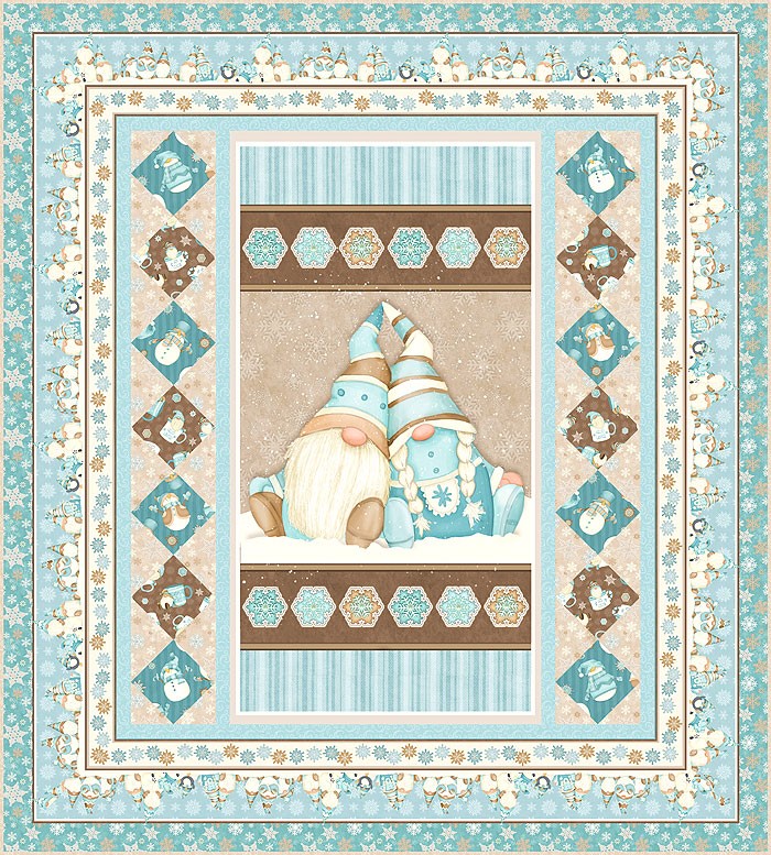 To make this 55″ x 60″ quilt design, you will start with the central panel featuring 2 adorable Gnome figures and the Hexagon Snowflakes. Then fussy cut and piece the diamond blocks on-point, and add the engineered stripe and other coordinates to make the border.